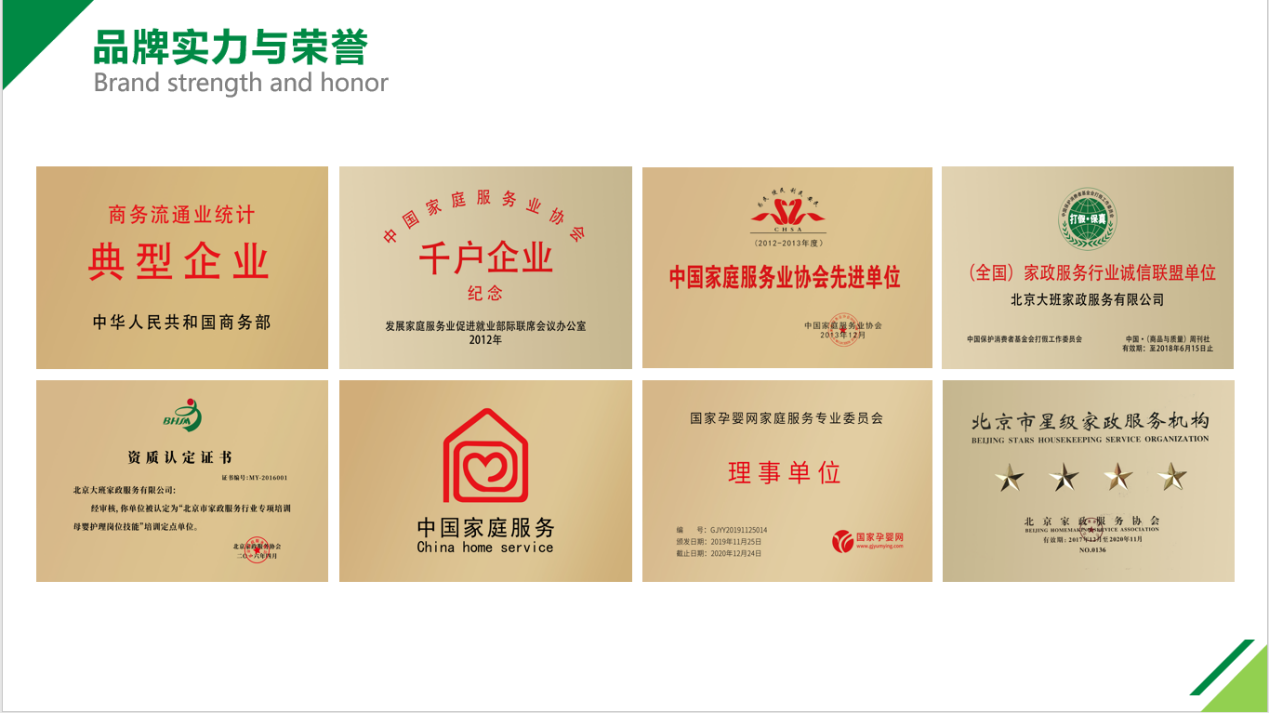 大班家政品牌创立于2006年,全国千户百强企业,北京四星级(最高星级)服务企业主要为家庭、医院提供月嫂、育儿嫂、高端保姆、家庭教师、病患照护等全品类综合家政服务,长期开设各项专业家庭技能培训。公司依托先审核后培训,不培训不入户的服务理念,十五年间为海内外客户提供了高品质服务。